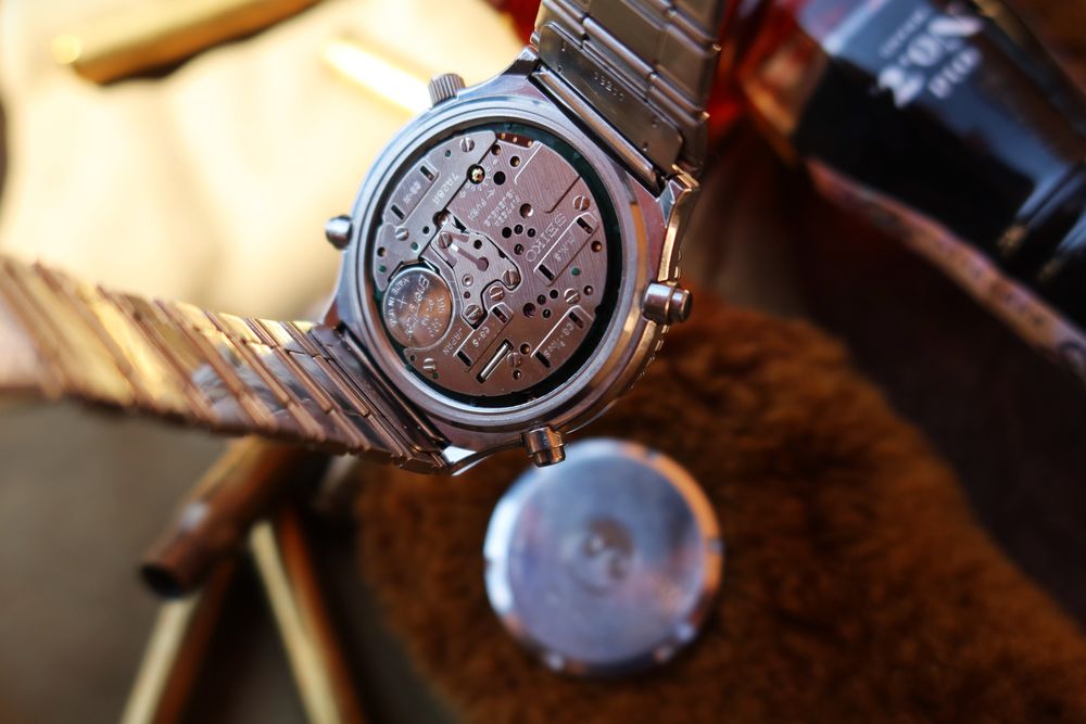 Uvnitř tiká: Cal. 7A38A, 15 Jewels. Je to ještě poctivá kovářská práce bez plastových dílů, servisovatalný, regulovatelný. Jedná se o první quartový analogový chronograph. Funkce stopek, split time, rychlo překlápění je v pořádku. 4/2026 vložena nová baterie energizer.